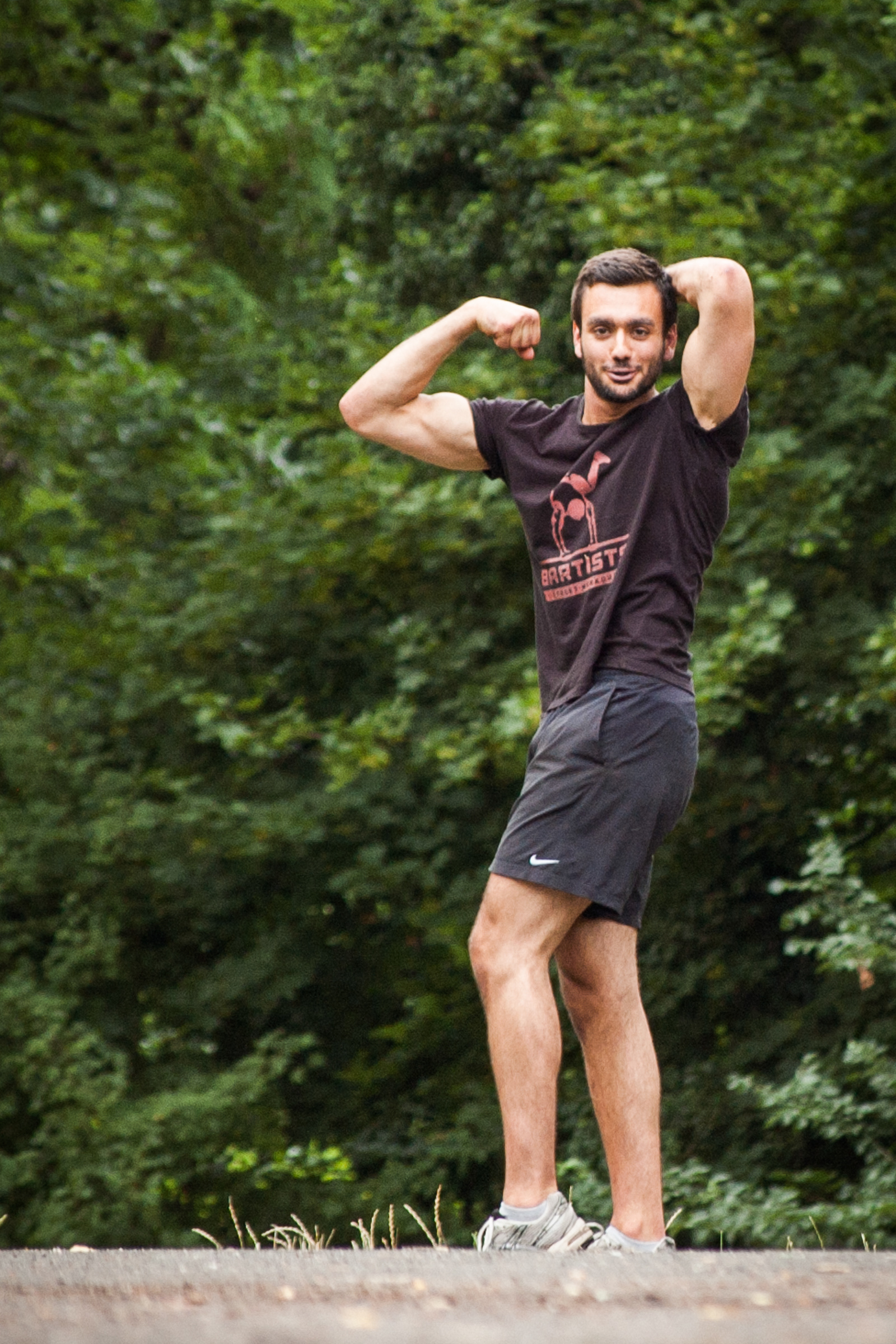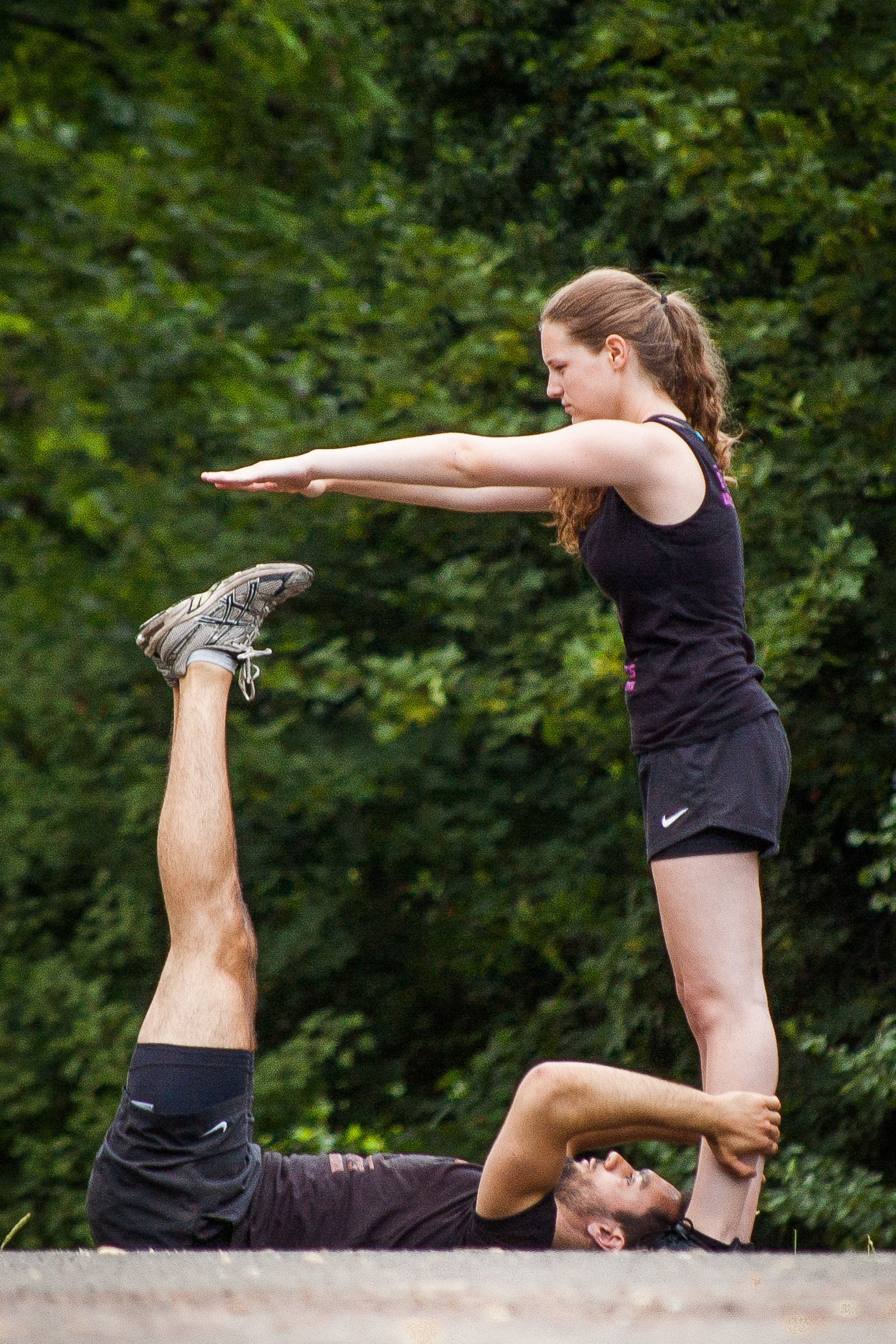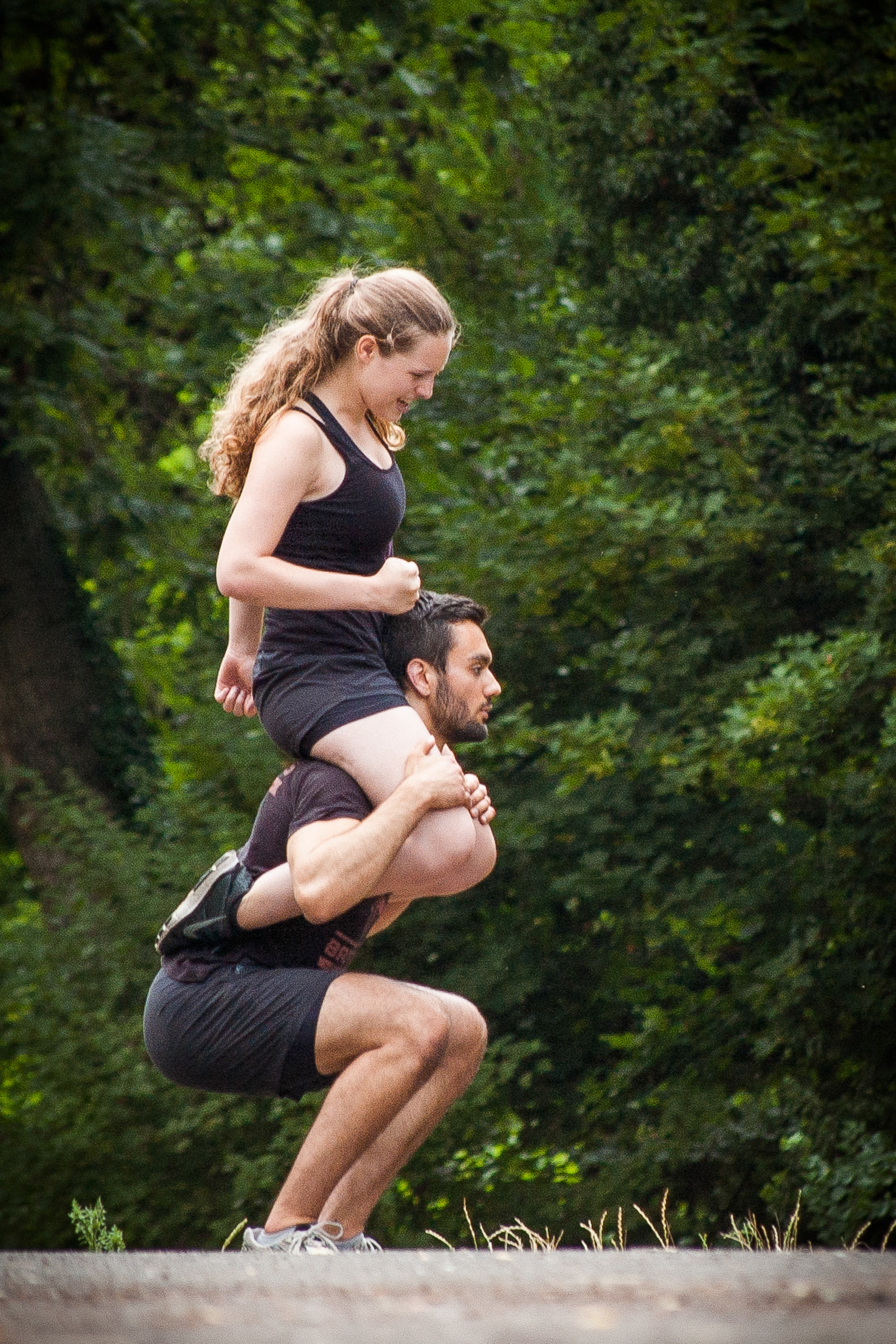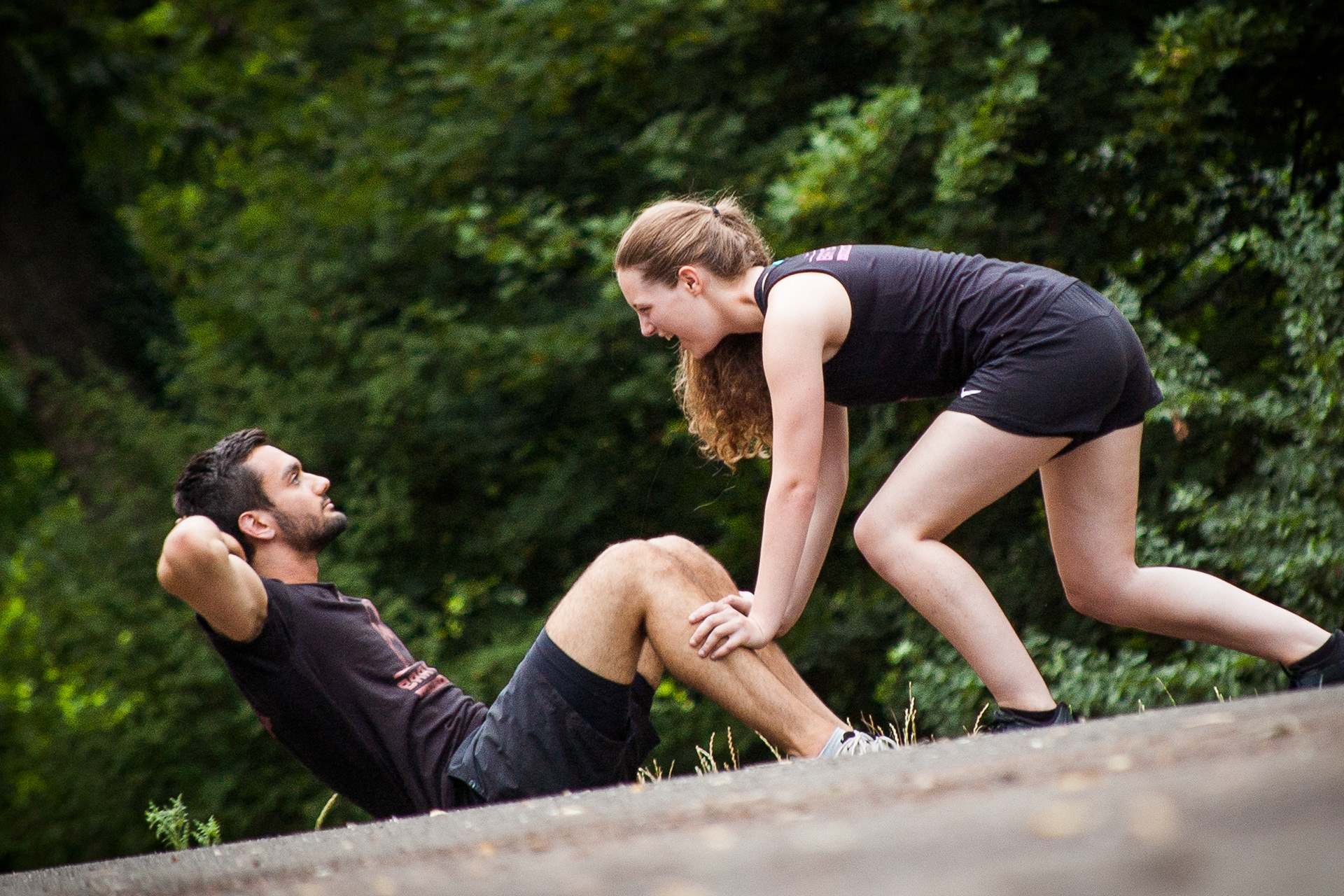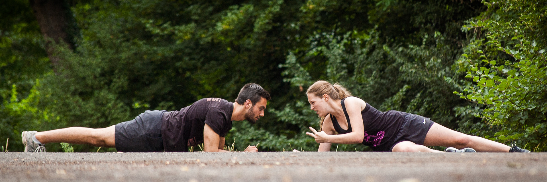 Team partners working out together, doing bodyweight exercises (calisthenics) outdoors in a local park.
